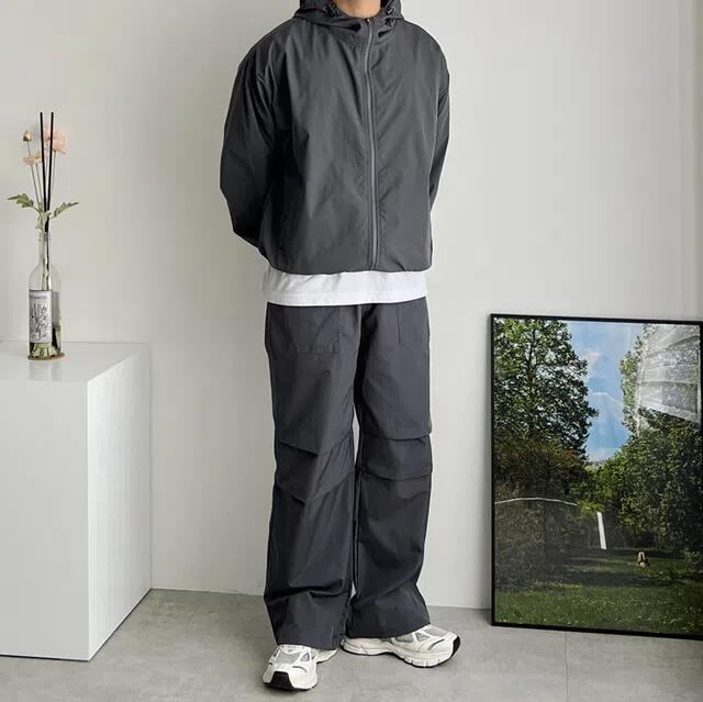 네이비나 베이지 컬러의 넉넉한 오버핏 바람막이에 탄탄한 실루엣의 파라슈트 팬츠를 조합하면 편안하면서도 아웃도어 특유의 감성을 살릴 수 있습니다.