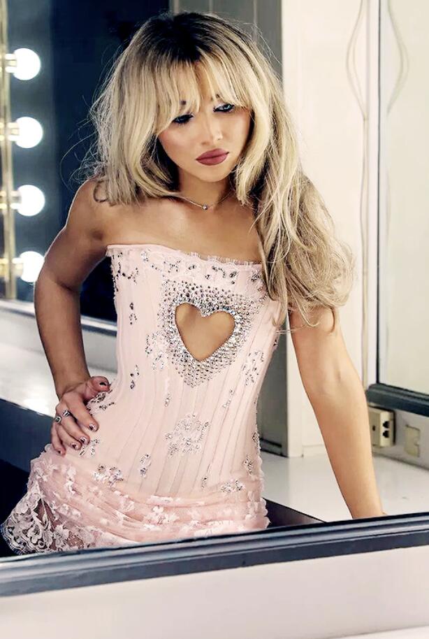 사브리나 카펜터는 파스텔 톤의 란제리 룩에 볼륨감 있는 미니스커트를 매치하여 소녀다운 감성과 성숙한 여성미를 동시에 보여주는데요.